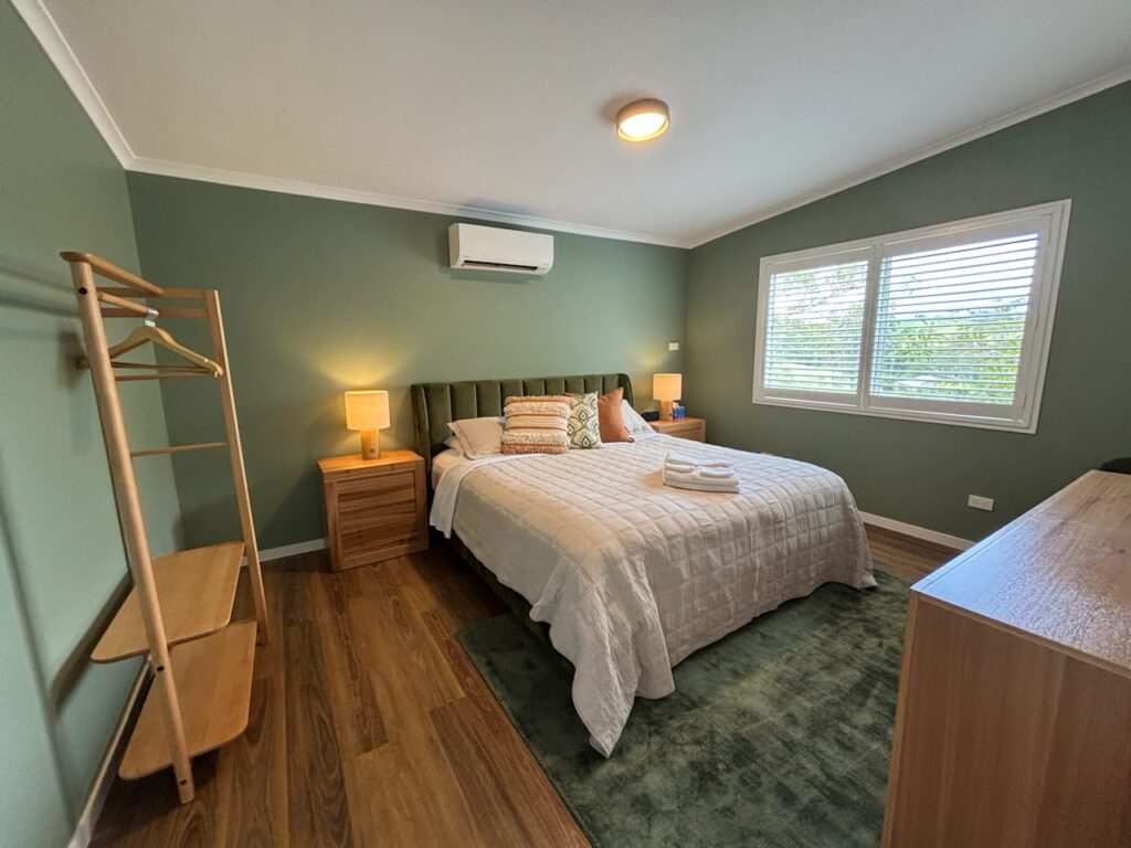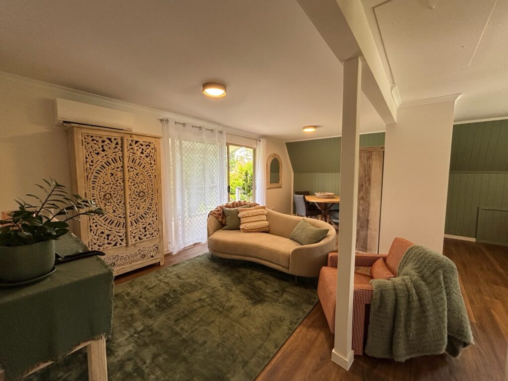 Private. Elegant. A Home Away From Home. Nestled within the peaceful landscape of Living Valley, our newly completed A-Frame Villa offers a beautiful blend of contemporary comfort and nature-inspired design, a true home away from home, created for deep rest, relaxation and renewal. This villa features a plush velvet king bed and air conditioning in all rooms, ensuring year-round comfort. The gorgeous open-plan lounge, includes a Samsung TV for relaxed evenings and quiet downtime, allowing you to unwind in comfort and style. The thoughtfully designed kitchenette is equipped with a fridge, kettle and washing machine, making longer stays effortless and inviting a sense of ease and familiarity throughout your retreat. A large round dining table provides a welcoming space for chats over tea, journaling and peaceful reflection. The luxurious bathroom is a true highlight, featuring a deep soaking bathtub, double vanities, and refined finishes that elevate everyday rituals into moments of indulgence. This villa offers dual access, with a private rear walkway entry and front steps leading onto a spacious verandah. From here, enjoy gorgeous views across the valley and surrounding nature, the perfect place to slow down, breathe deeply and reconnect. Designed with comfort, warmth and elegance in mind, our A-Frame Villas provides a beautiful balance of homely ease and refined style, offering a nurturing sanctuary within the Living Valley experience.