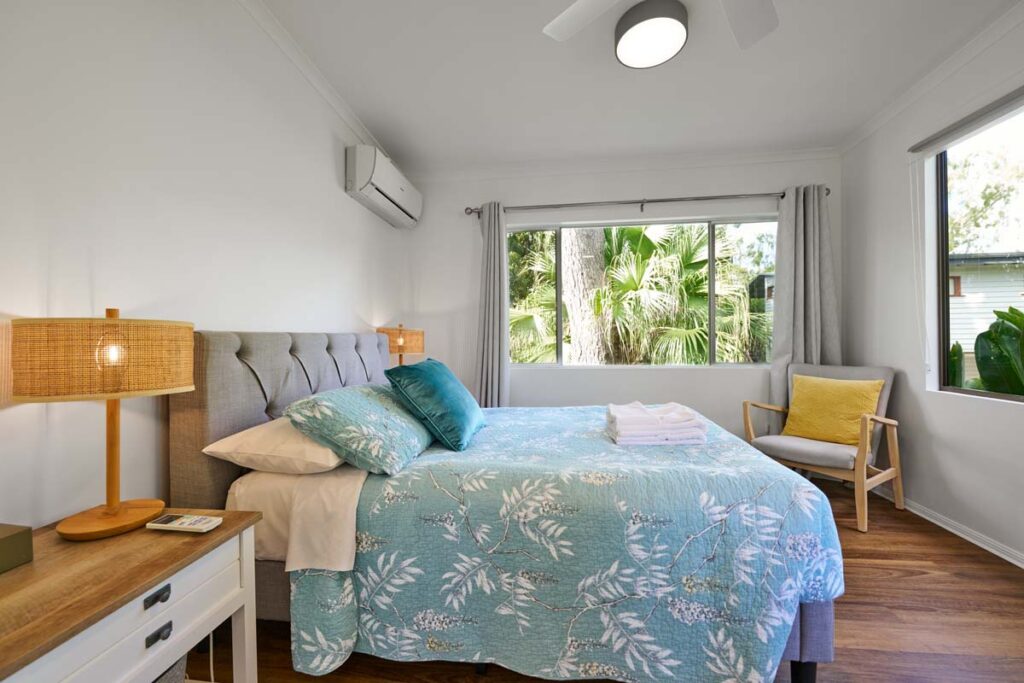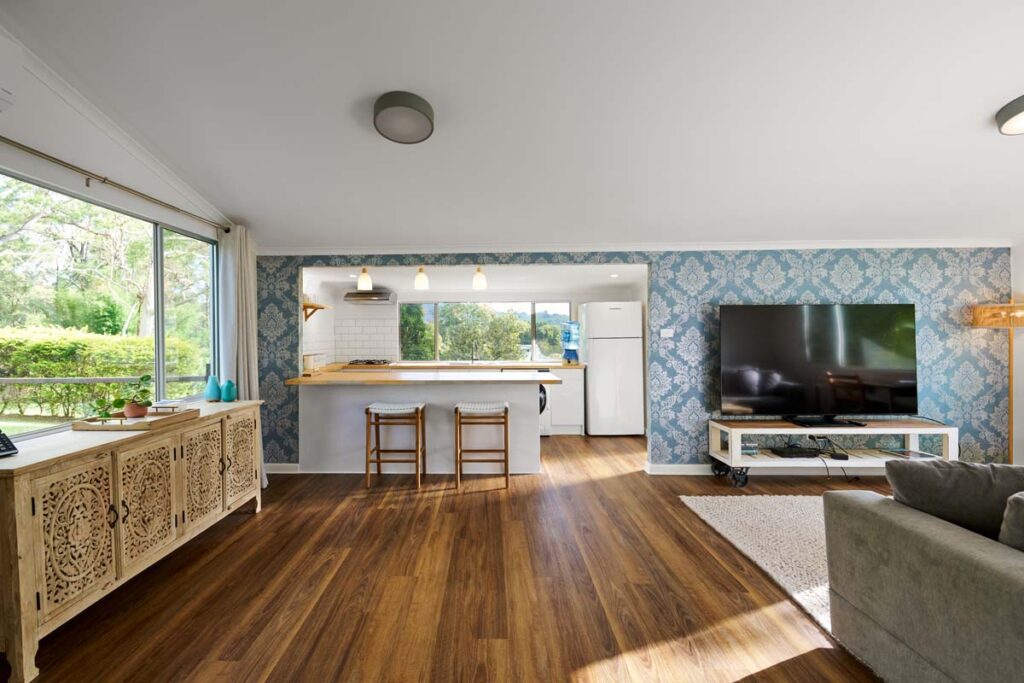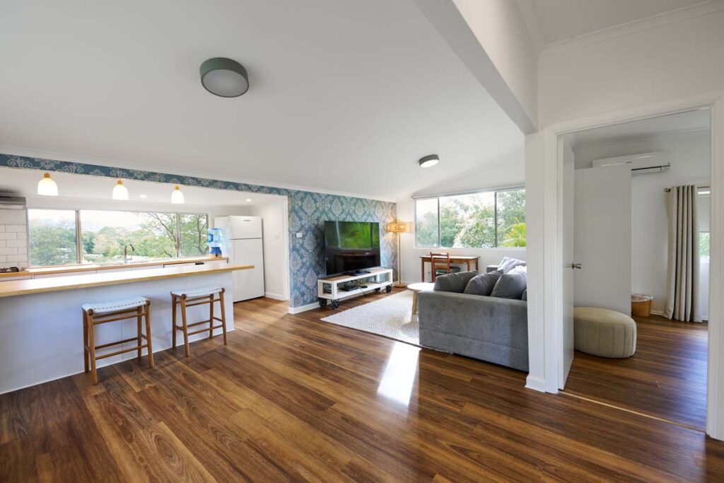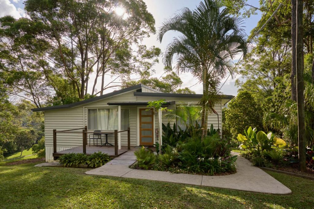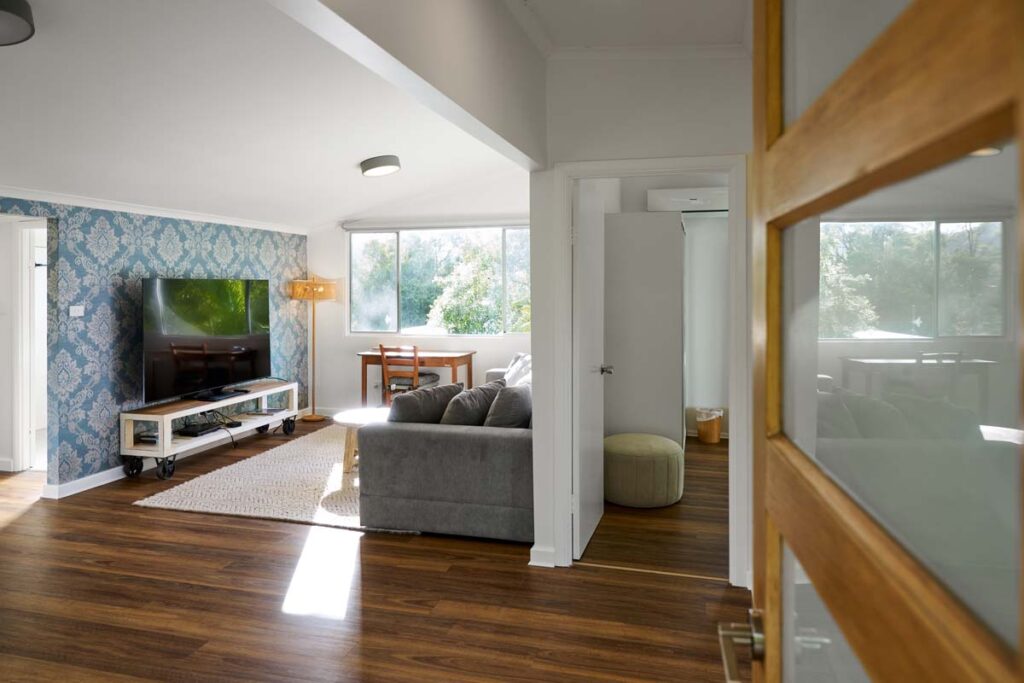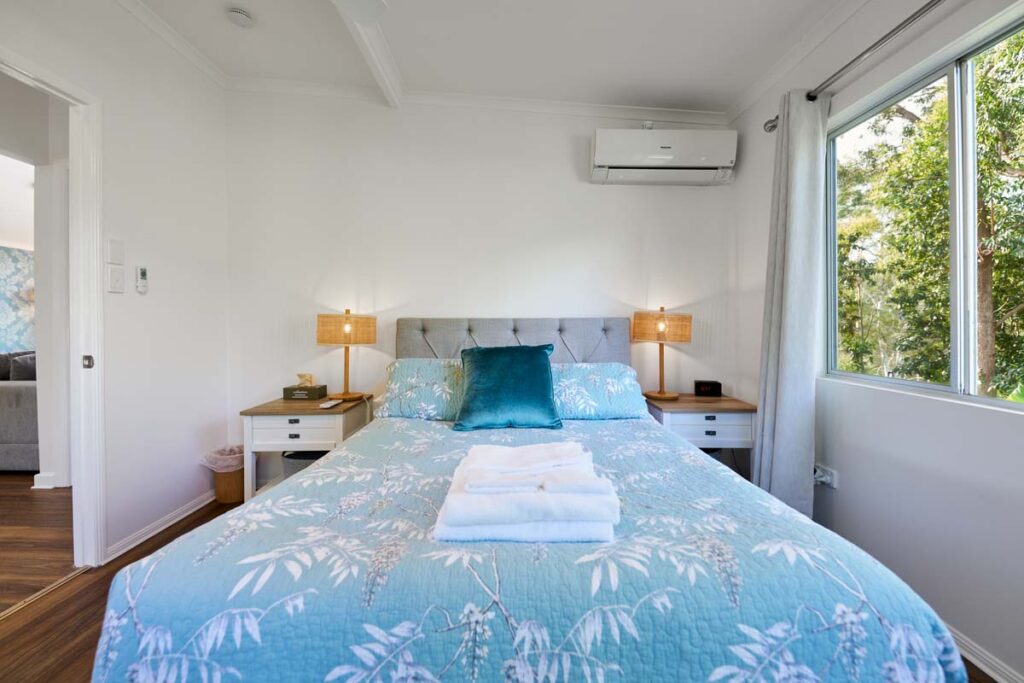Banksia Cottage is a private two-bedroom villa. With a king bed in Room 2A and a double bed in Room 2B, this standalone cottage offers complete privacy and stunning valley and mountain views. The east-facing veranda is perfect for soaking up the morning sunshine. Ideal for a longer stay, the villa includes ample cupboard space, a fully equipped kitchen, a washing machine, and a cosy lounge with a Smart TV, DVD player, and Apple Box. Whether for a couple, friends, or a mother-daughter retreat, this bright, spacious cottage is the perfect escape.