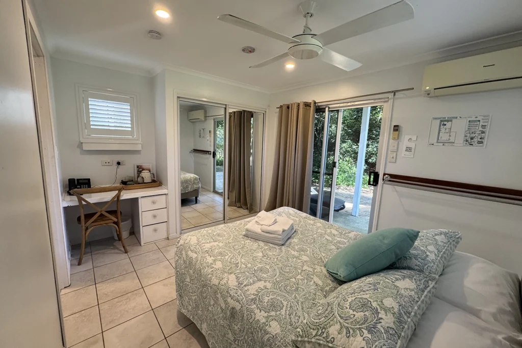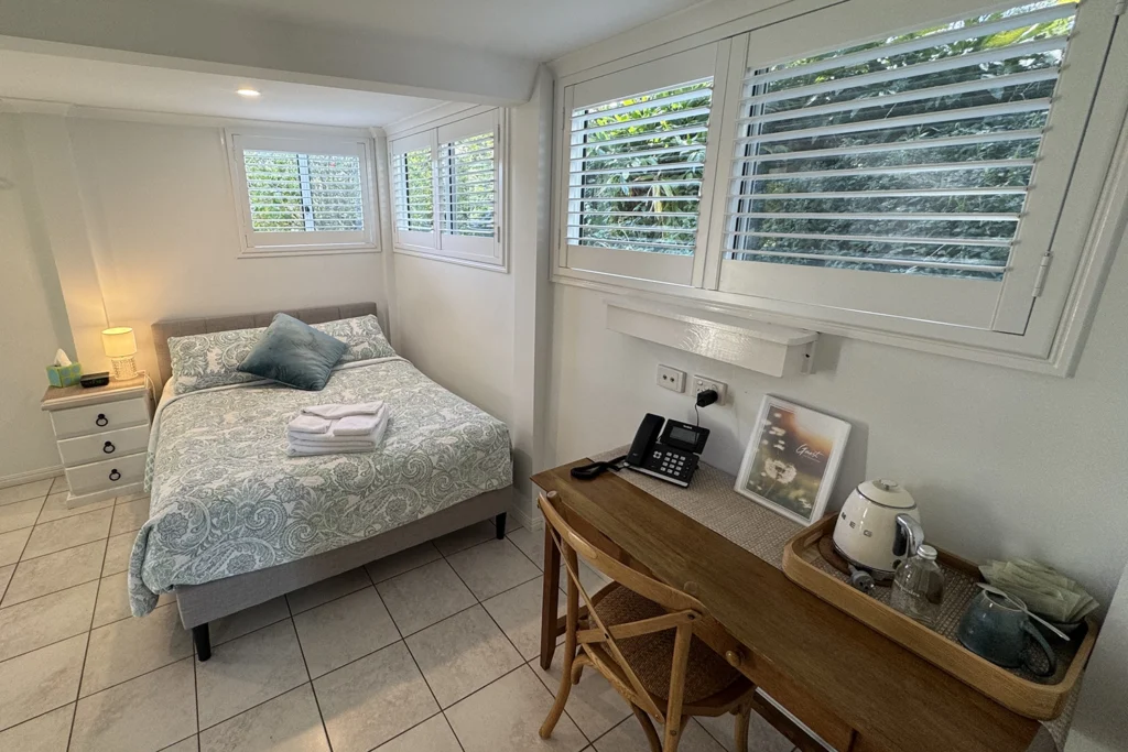 Nestled among lush gardens, Mango Manor offers cosy, ground-level rooms 3A and 3B, each featuring a comfortable double bed. Accessible through glass sliding doors, these inviting spaces provide a serene retreat with distant views. Ideal for those valuing simplicity, each room includes a large wardrobe and a writing desk perfect for journaling. Guests will enjoy the convenience of shared bathrooms and laundry facilities, making it a practical choice for short or extended stays. Experience a homely atmosphere where comfort meets functionality, ensuring a restful and productive getaway at Mango Manor.